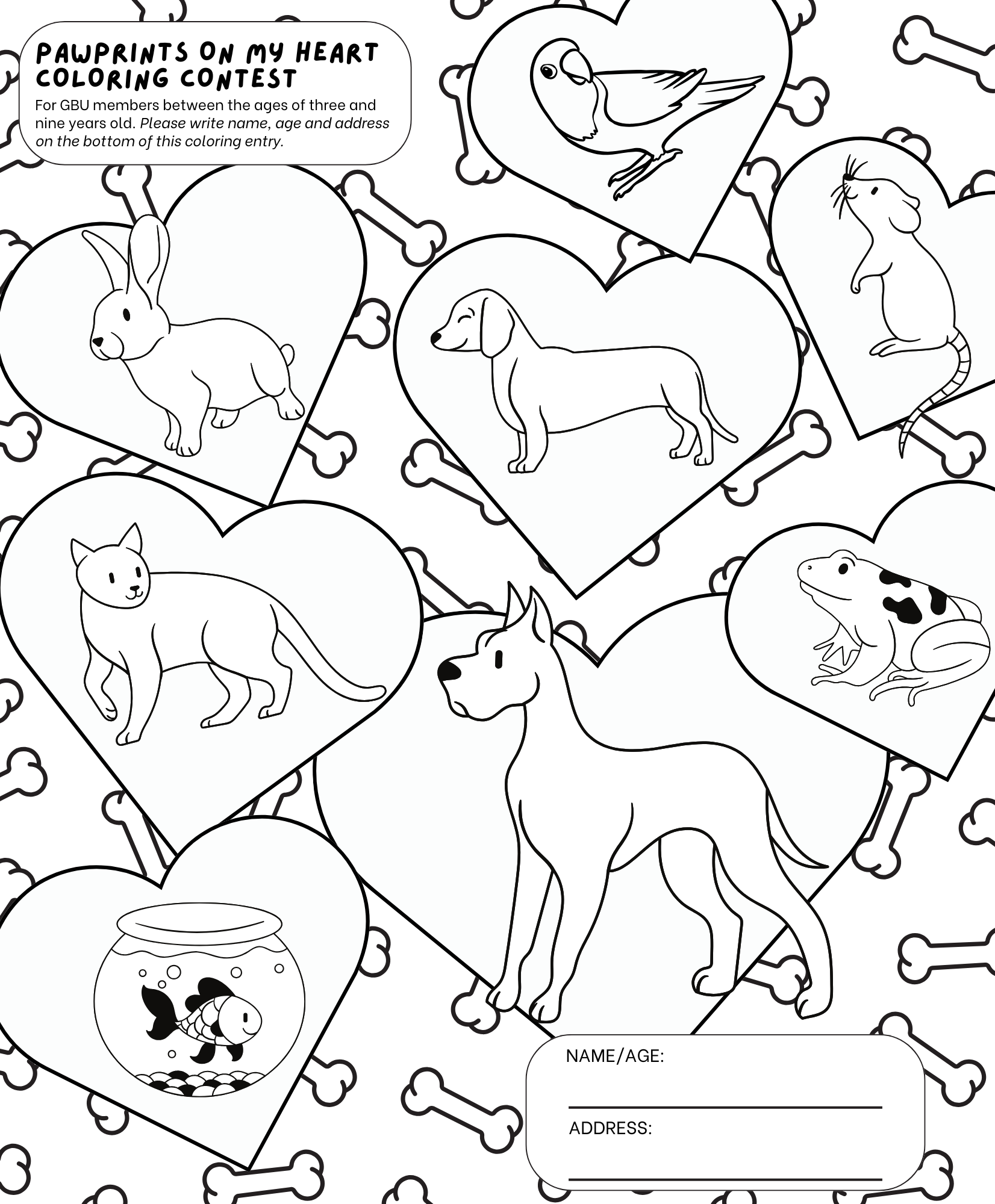 GBU members between the ages of three and nine years old can enter their colored page in this year's contest, which is themed Pawprints on My Heart.