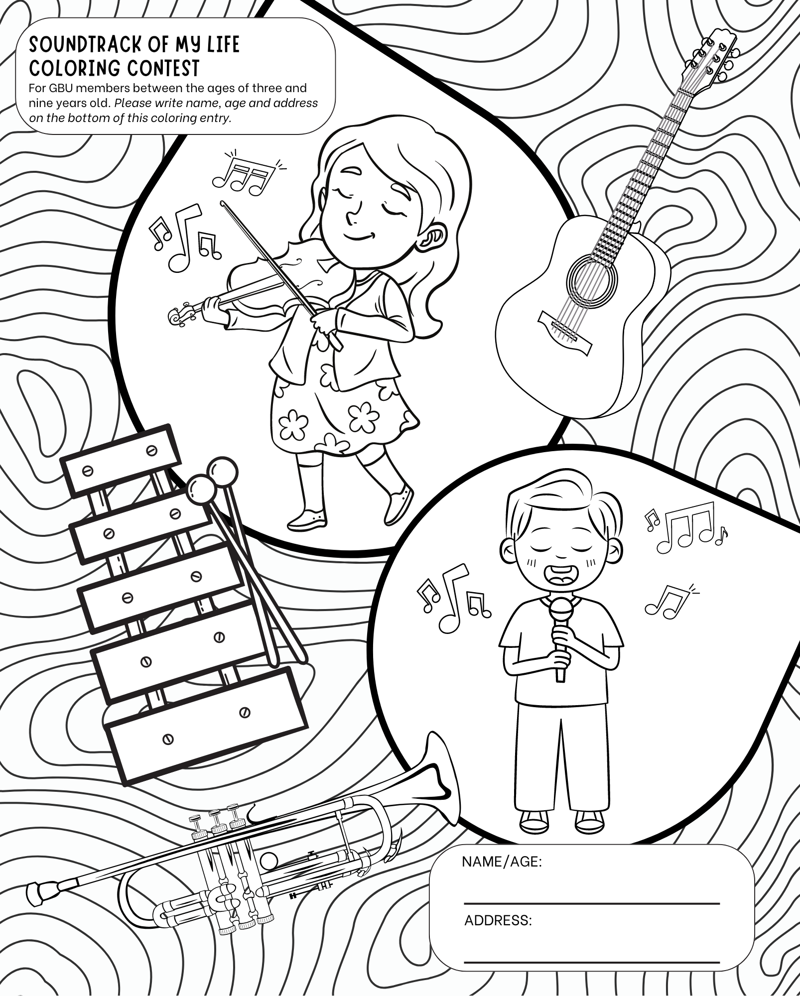 GBU members between the ages of three and nine years old can enter their colored page in this year's contest, themed: Soundtrack of My Life.