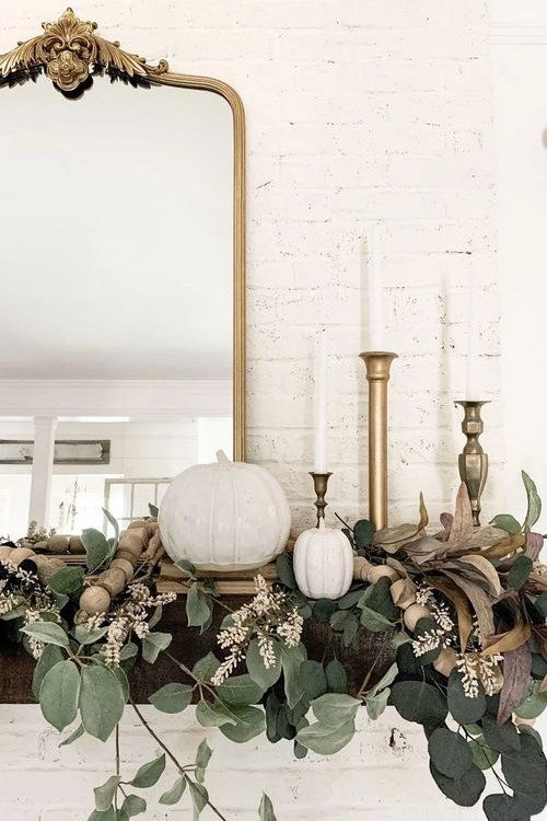 A garland of eucalyptus works as a solid base that can be used to transition your décor from fall to winter with ease. In the fall, pair this string of beautiful, green leaves with white pumpkins (real or faux) to achieve a classic, upscale and timeless feel. For a modern farmhouse approach, this eucalyptus strand goes well with wooden, beaded décor and natural tones.