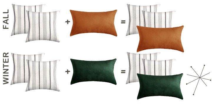 Throw pillows with interchangeable covers are a staple in transitional home décor. With removable pillow covers, you can easily wash them, and swap them out each season without breaking the bank! In order to visually anchor your set of throw pillows, opt for an 18"x18’’ pillow cover that’s neutral and matches your sofa. Use a 12"x20’’ throw pillow as an accent that will represent the seasonal aesthetic you’re trying to achieve. In the example below, we chose a burnt orange for autumn and a forest green for winter. Both covers are velvet, which brings a warm textile to the mix and makes your couch extra cozy during the cooler months. Don't be afraid to mix and match patterns and textures!