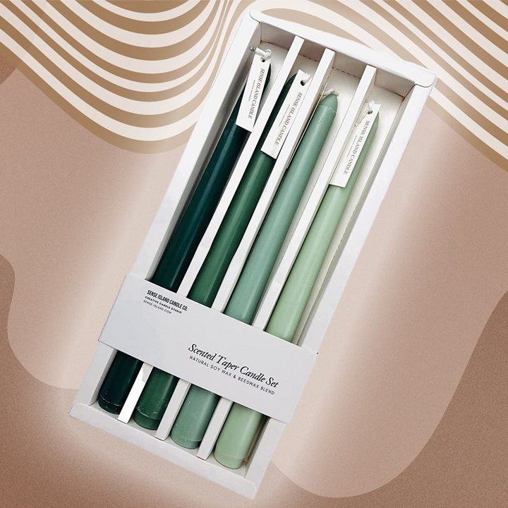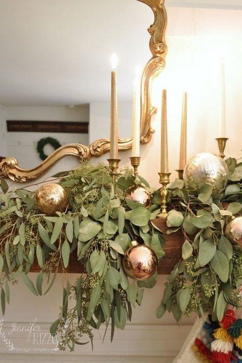 Winter is a great time to be playful with colored taper candles and jewel-toned ornaments. Create a classic, elegant display above a roaring fireplace, and watch the flickering flames of your candles dance to holiday music. The contrast of the bright, symmetrical shape of a gold candlestick amongst the subdued, organic and free-flowing shape created by a eucalyptus garland creates a visually interesting display that infuses a room with style.